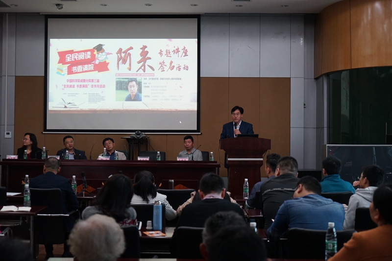 成都分院综合办主任江晓波代表成都分院分党组书记王学定发表致辞,指出广大科研人员和学生不仅要参与和践行全民阅读,更要以科学院的榜样精神来引领全民阅读,并希望通过阅读进一步丰富科学院文化体系建设的内涵,从而持续推动成都分院“书香社会”建设的大发展。中心主任张志强研究员致辞,首先表达非常高兴四川省作家协会主席、当代著名作家阿来先生来做精彩的报告,对举办本届读书月的活动意义和内容进行了简要阐述,提出文献情报机构(图书馆)要转变服务理念,从满足读者需求向开发用户需求转变、从服务读者向组织读者转变、从知识资源提供保障服务向知识资源挖掘利用服务转变,以缩小与我国建设学习型社会、文化强国、科技强国的目标之间的差距。同时,强调科技与文化是相互依存、彼此交融的,科技发展为创造和发展文化提供物质基础,文化为科技的进步提供精神动力和思想支持??萍嘉幕丫晌贝钪匾男挛幕窒???萍加胛幕娜诤戏⒄?,将不断展示出强大的生命力。