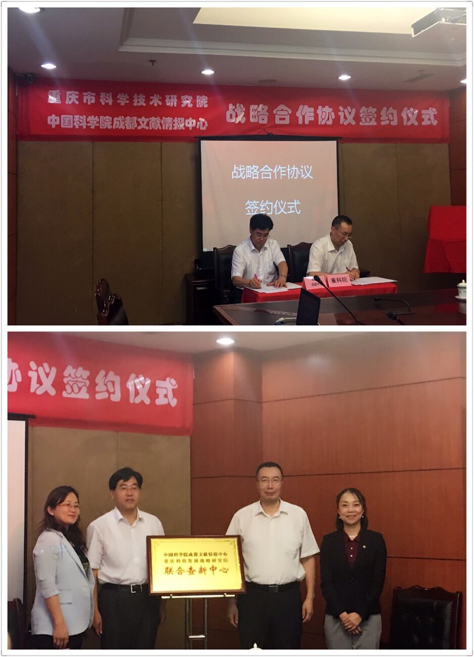 2017年5月27日,中科院成都文献情报中心与重庆市科学技术研究院在重庆科学技术研究院召开合作座谈会并签订战略合作协议。中科院成都文献情报中心主任张志强及副主任杨志萍、科技处副处长张邓锁、科技服务专员等一行五人,重庆市科学技术研究院副院长刘斌、重庆科技发展战略研究院董事长陈勇以及来自院属单位科技发展战略研究院、自动化所、机电院、重庆科技检测中心、重庆应用技术有限公司、科技处、资产处、办公室等处室部门和成员单位的负责人20余人参加谈会和签约仪式。重庆科技发展战略研究院董事长陈勇主持了会议。