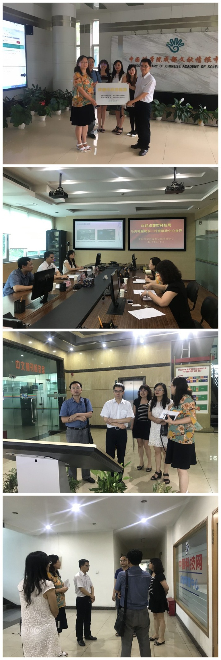 7月5日下午,成都市科技局马良乾副局长、许文智调研员、龚明霞部长一行专程来成都文献情报中心调研科普工作,并对中心2017年获批的成都市科普基地授牌。该基地牌匾是由成都市科技局、中共成都市委宣传部、成都市教育局和成都市科学技术协会共同颁发。中心副主任杨志萍主持此活动,信息服务部主任鄢小燕、科普主管许文娟参加活动。