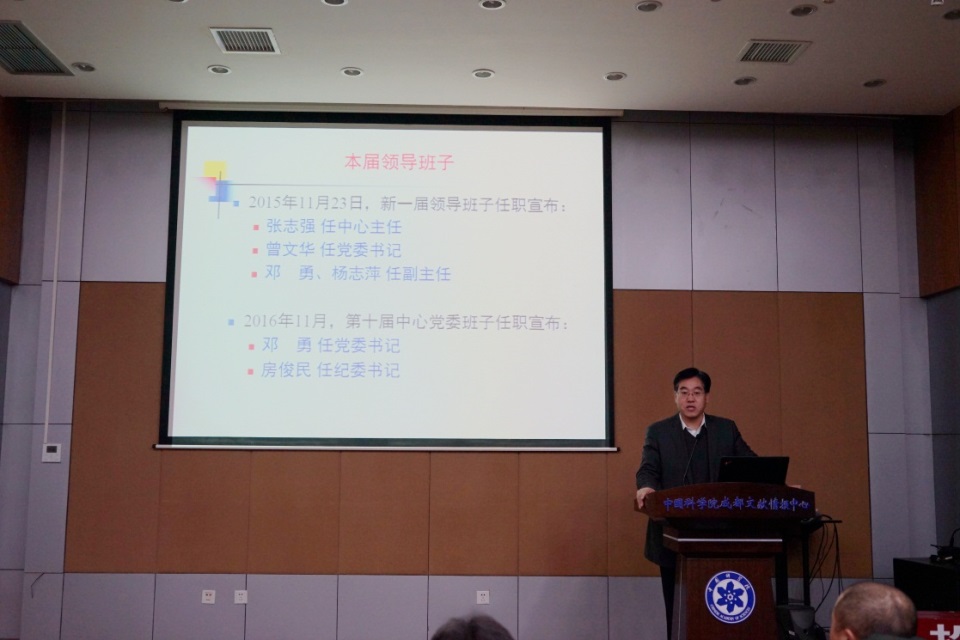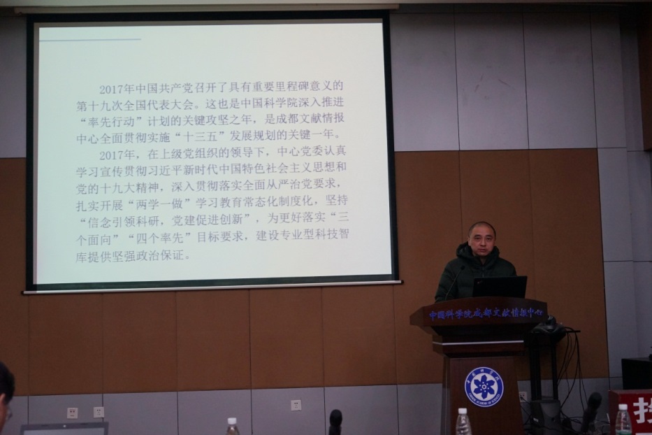 邓勇报告了2017年度党建工作。2017年,在上级党组织的领导下,成都文献情报中心党委认真学习宣传贯彻习近平新时代中国特色社会主义思想和党的十九大精神,深入贯彻落实全面从严治党要求,扎实开展“两学一做”学习教育常态化制度化,坚持“信念引领科研,党建促进创新”,为更好落实“三个面向”“四个率先”目标要求,建设专业型科技智库提供坚强政治保证。邓勇指出,2018年中心党委将继续充分发挥其政治核心、监督保证、组织保障、宣传教育等重要作用,在加强领导班子和干部队伍建设、加强基层党组织建设和党风廉政建设、做好统战群团工作、营造和谐奋进的创新文化氛围等方面取得新的成绩。